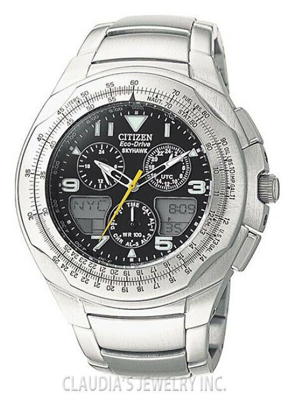 From the Citizen Eco-Drive® Promaster Skyhawk A-T Collection, this watch features a dark blue dial with digital and analog chronograph sub-dials, perpetual calendar, atomic timekeeping abilities in 43 cities, alarms, rotating slide rule bezel, and sapphire crystal in a 45.0mm titanium case. Japanese quartz movement ensures accurate timekeeping, and the Citizen Eco-Drive® technology harnesses the power of any light source so it never needs a new battery. The titanium link bracelet secures with a fold-over clasp. Water-resistant to 200 meters.