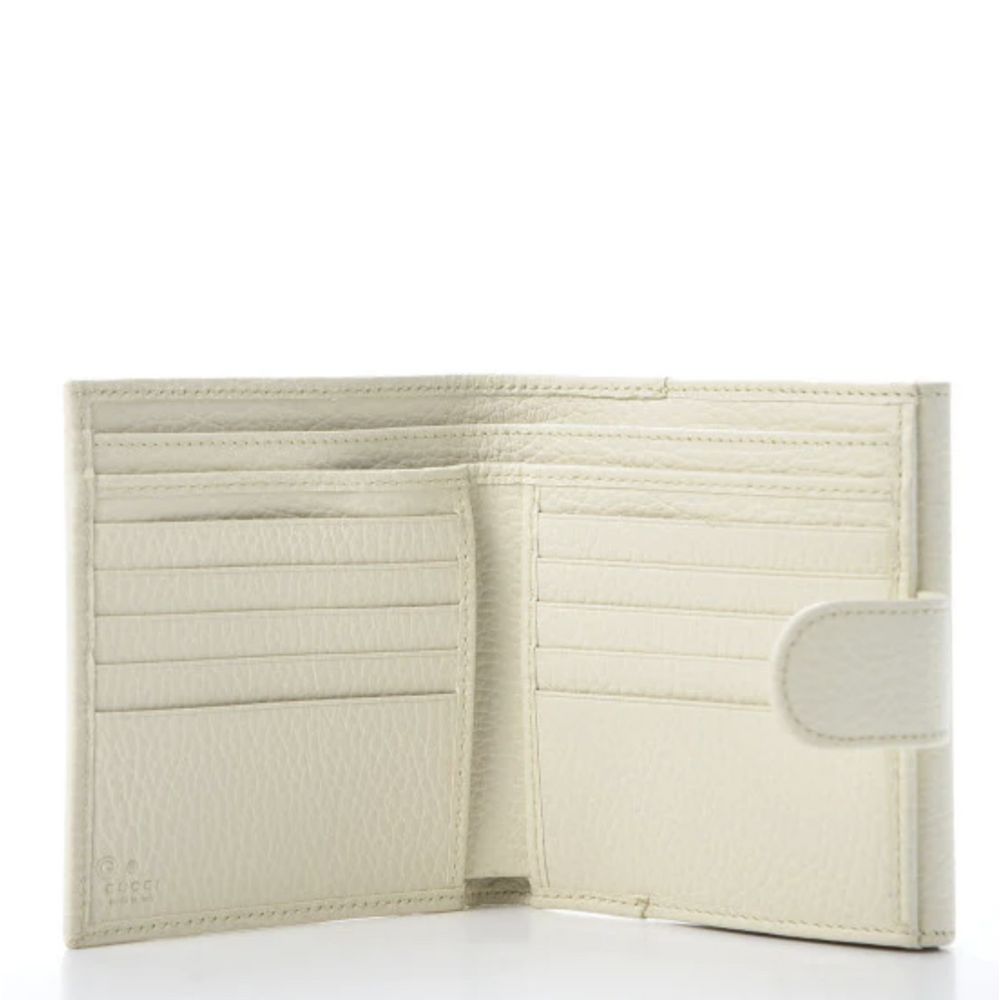 Indulge in the luxury and sophistication of a pristine ivory white leather wallet from the esteemed house of Gucci. This bifold wallet seamlessly combines functionality with elegance, featuring a dedicated card holder and a secure coin purse. Accented with a tasteful silver metal logo, it exemplifies Italian craftsmanship at its finest. Compact yet spacious, it measures at 12cm x 11cm x 3cm, fitting comfortably in your hand or bag.