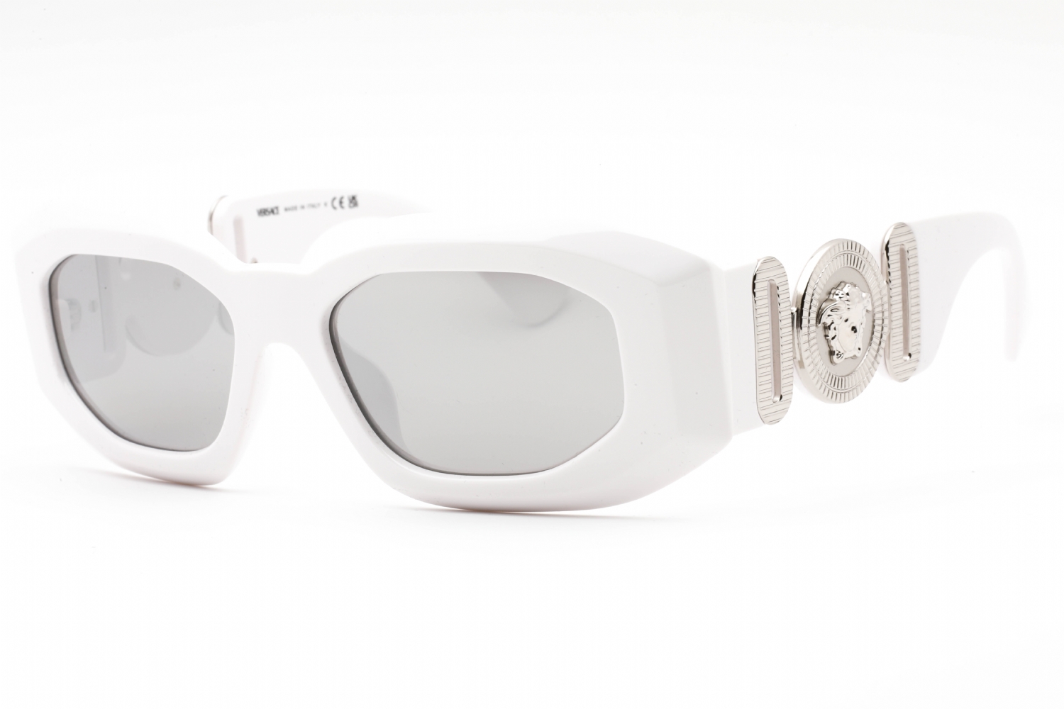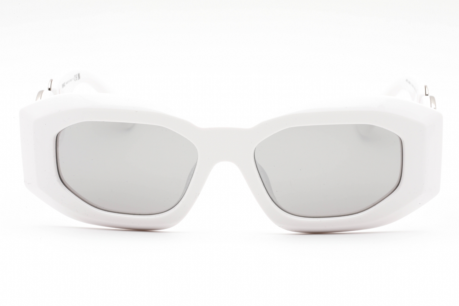 - Versace 0VE4425U White Light Grey Mirror Silver Sunglasses. These luxurious sunglasses showcase a chic, rectangular frame in crisp white acetate, accented by mirrored light grey lenses and silver detailing